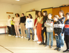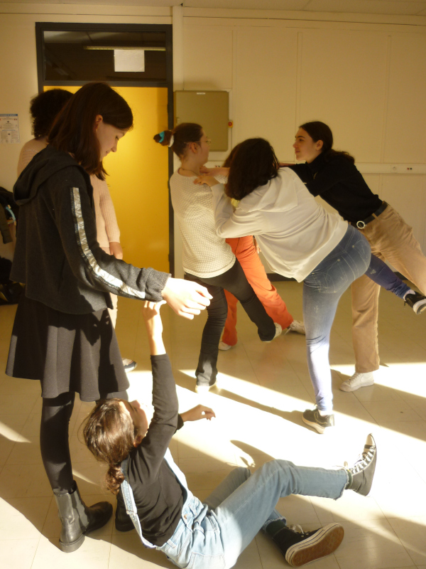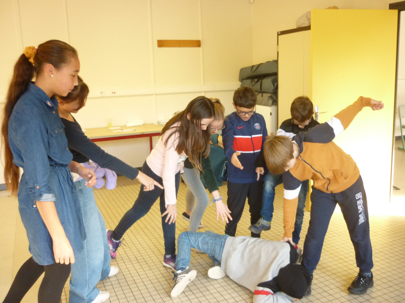 Le thème de la comédie musicale de cette année, travaillée conjointement avec Madame Evano, enseignante d’éducation musicale, étant le harcèlement, ils ont improvisé par groupes sur le sujet. À la fin de la séance, des élèves ont accepté d’interpréter des personnes victimes.