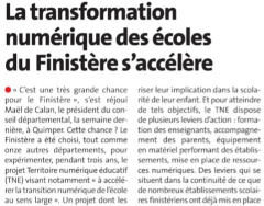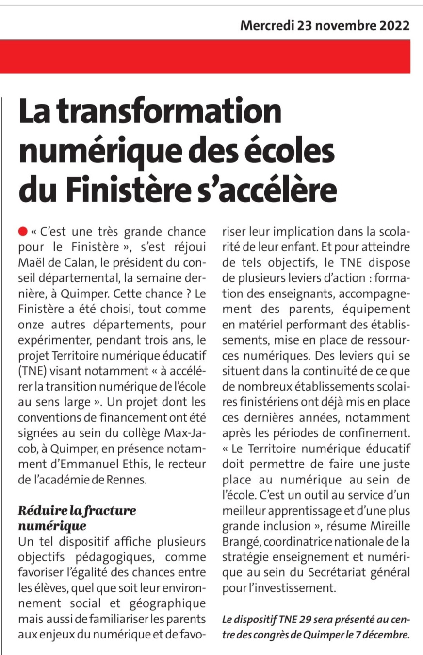 Le journal Le Télégramme du mercredi 23 novembre 2022 contenait un article concernant la venue de M. Le Recteur et de M. Président du Conseil départemental pour la signature de la convention Territoires Numériques Educatifs. Cet évènement a eu lieu le mardi 15 novembre 2022.