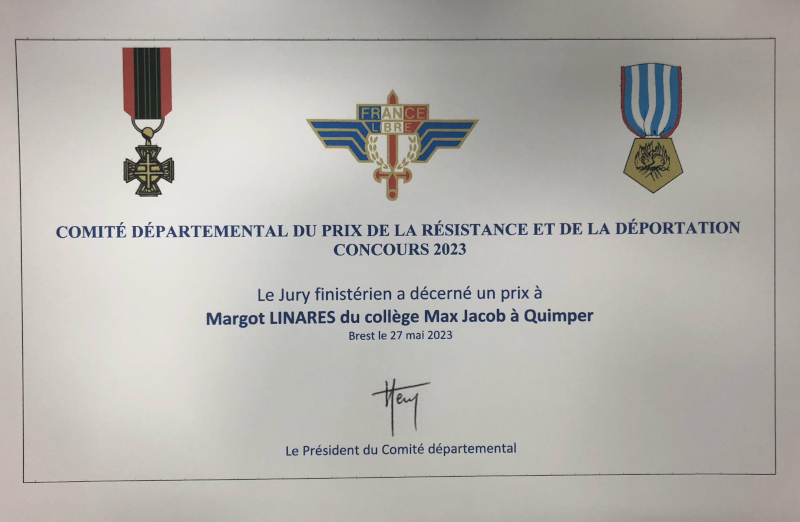 Le collège Max Jacob la félicite pour son implication et la qualité de son travail.