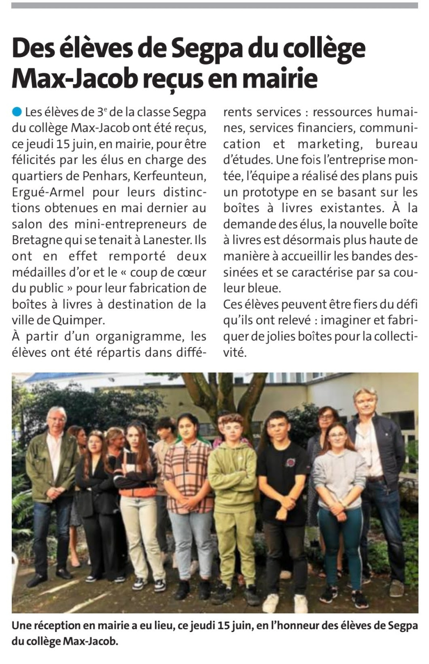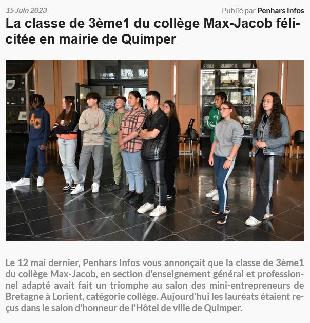 Jeudi15 juin, les élèves de 3ème1 se sont rendus à la mairie pour être félicités du parcours de leur mini-entreprise, « Un max de livres ».