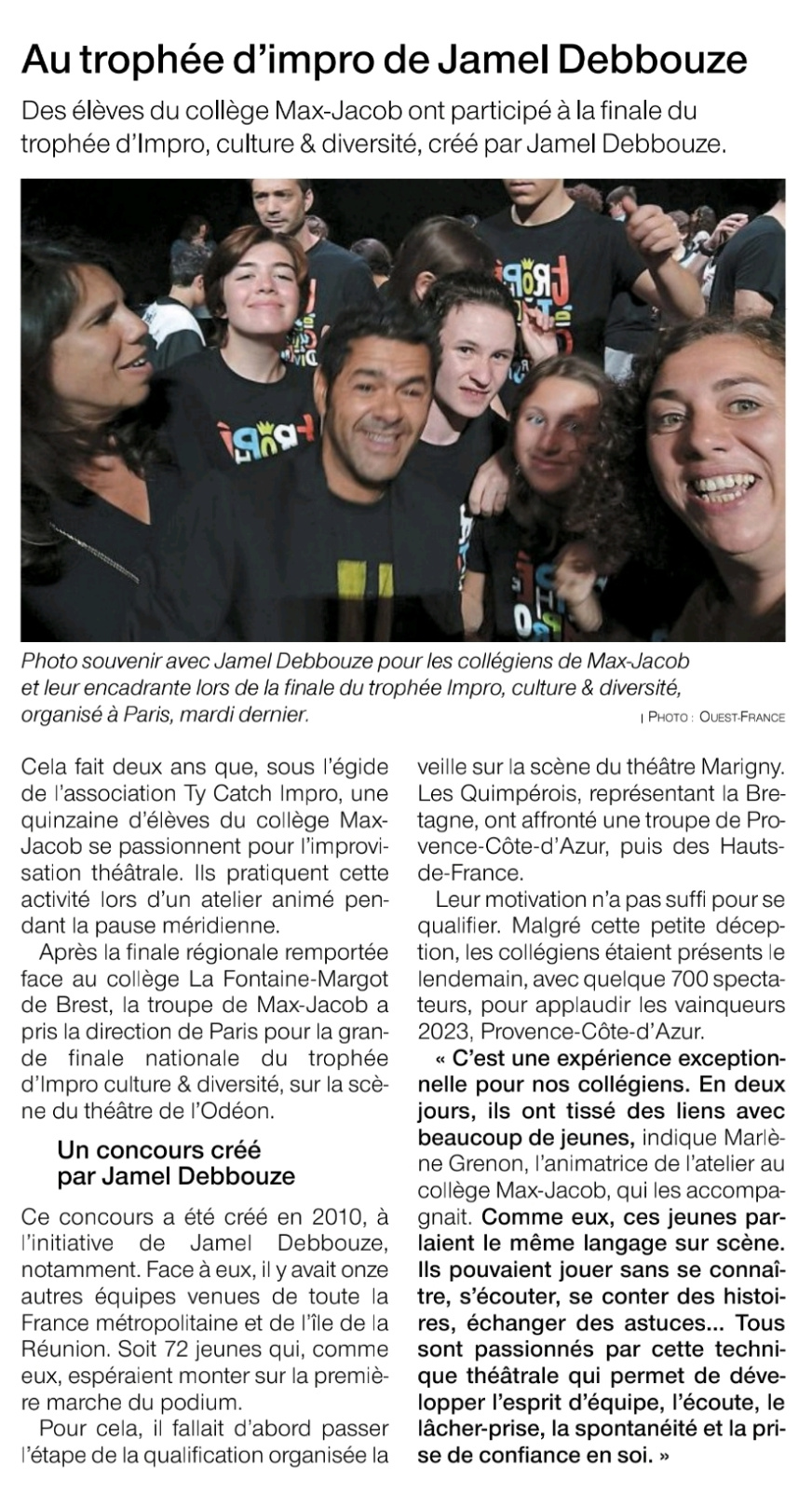 Les élèves qui ont fait le déplacement à Paris pour la finale nationale de théâtre d’improvisation ont les honneurs de Ouest-France, ce lundi 26 juin.