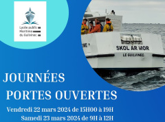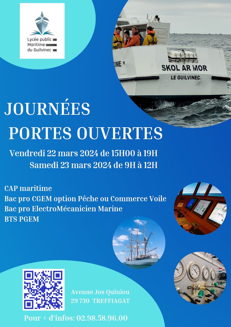 Vous trouverez ci-dessous l’affiche communiquant les dates des portes ouvertes du lycée maritime du Guilvinec ( 22 et 23 mars 2024) ainsi qu’un livret synthétique sur les formations qui y sont préparées et informations pratiques (en pièce jointe).