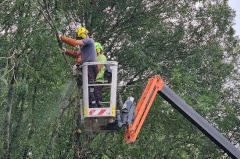Les élagueurs sont dans le parc du collège ce mois de juillet 2024 pour effacer les dernières traces de la tempête Ciaran.