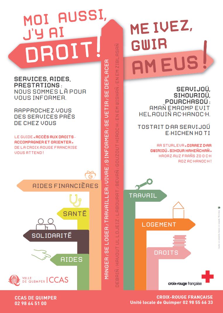 Le Guide Quimpérois : L’Accès aux Droits et aux Services - Accompagner et Orienter ; de la Croix-Rouge française vous fournit des informations sur les droits et prestations dont vous pourriez bénéficier, sur les structures et organismes pouvant faciliter votre accès à ces droits et prestations et répondre à vos besoins.
