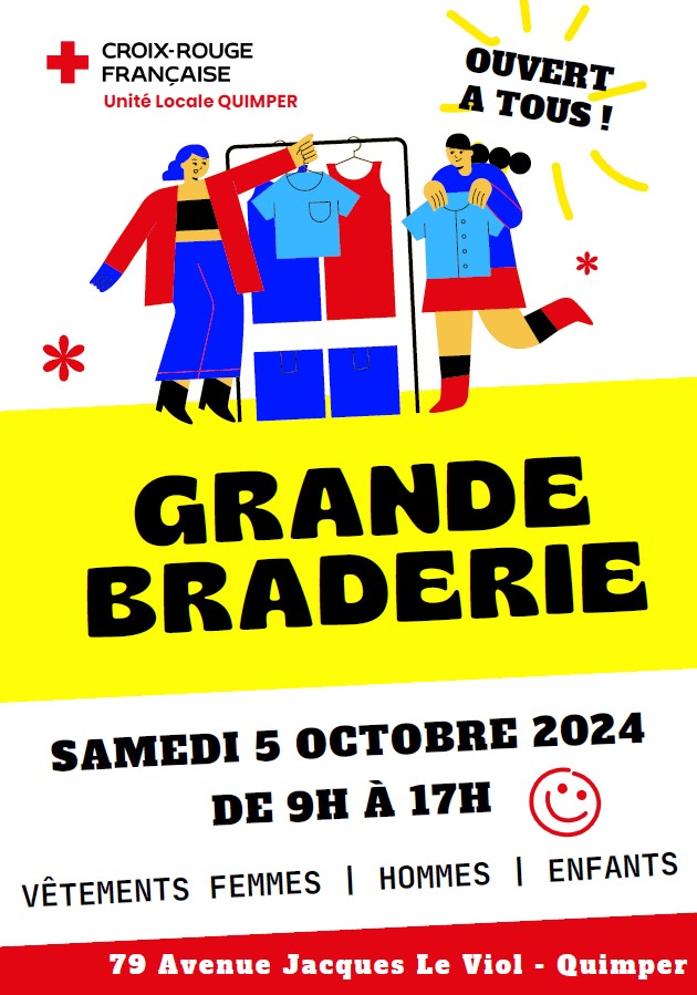 Vous pouvez noter dans vos agenda la grande braderie de l’Unité locale de Quimper de la Croix-Rouge française, qui aura lieu Samedi 05 octobre 9h-17h dans leurs locaux au 79 avenue Jacques Le Viol (quartier de Prat-Ar-Rouz, Penhars).