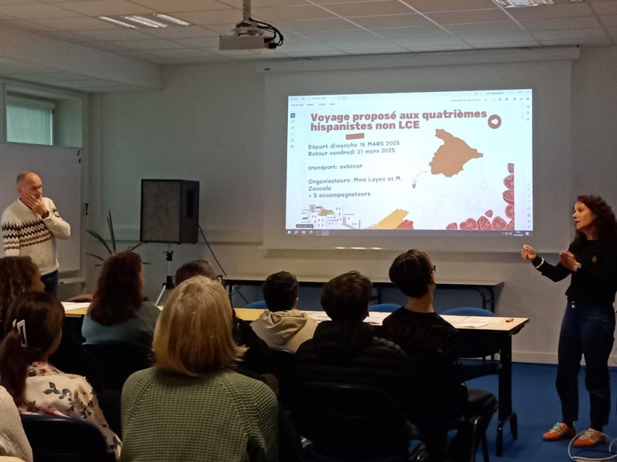 Lundi 14 octobre, les familles des élèves de 4ème2, 4ème3, 4ème4, 4ème5 et 4ème6 ne faisant pas LCE ont été conviées à une réunion d’information sur le futur voyage en Espagne, voté au dernier conseil d’administration.