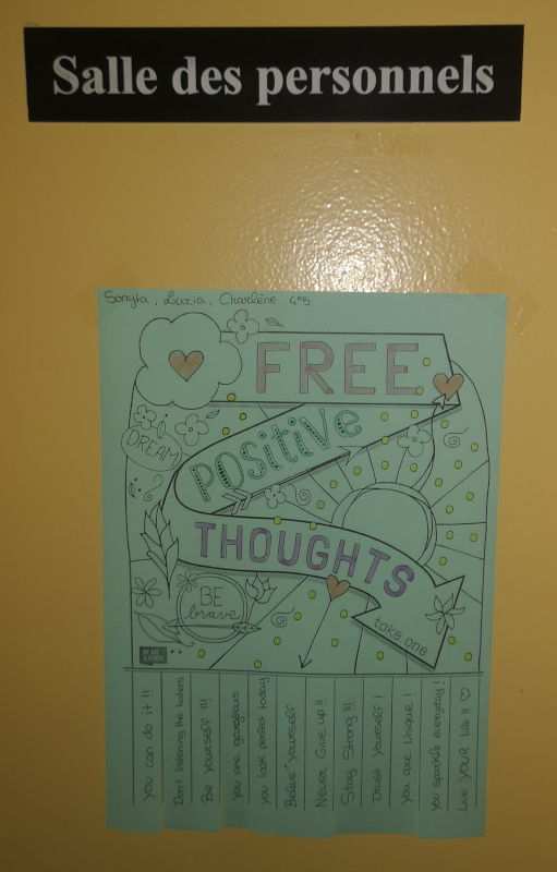 Chacun peut à sa guise piocher un compliment, encouragement, message de soutien et de solidarité en anglais sur des affiches imprimées en vert, couleur de la lutte contre le harcèlement scolaire.