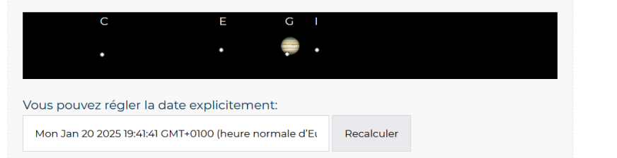 Sur le site « stelvision », on peut s’amuser à visualiser les positions des satellites de Jupiter et ensuite comparer son observation à l’oculaire du télescope. Voici ce que nous avons observé ce 20 Janvier.