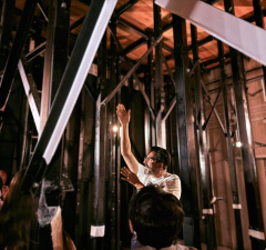 La visite s’est ensuite poursuivie dans les coulisses : de la régie technique aux loges en passant par le plateau, puis du sous-sol jusqu’au toit…