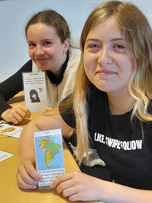 Accueillis et épaulés par Madame Montagne, les élèves ont construit pas à pas un jeu de cartes sur leur programme en inventant des questions et des réponses. Ils ont ainsi revu leurs cours, mais aussi travaillé le français et le traitement de textes notamment. Ils se sont bien investis et certains même en dehors de ce temps de cours.