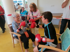 Les élèves ont été accueillis chaleureusement par le personnel et les résidents de l’EHPAD. Après une présentation rapide des équipes, les épreuves ont pu commencer : tennis, tir à l’arc, athlétisme , boxe et ateliers coopératifs avec la maison du patrimoine de Quimper ont permis à chacun de participer selon ses capacités. Ce moment de partage a favorisé l’entraide, la patience et l’écoute mutuelle.