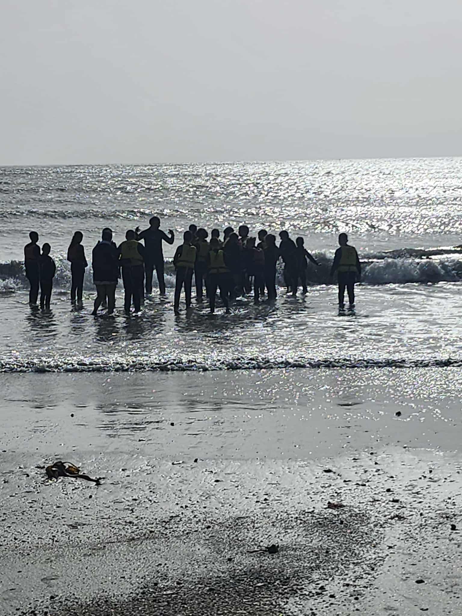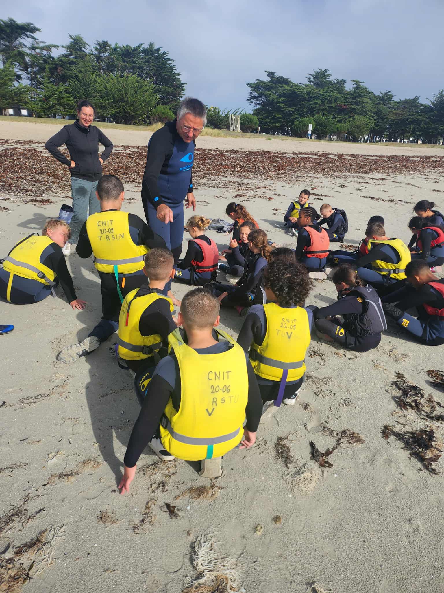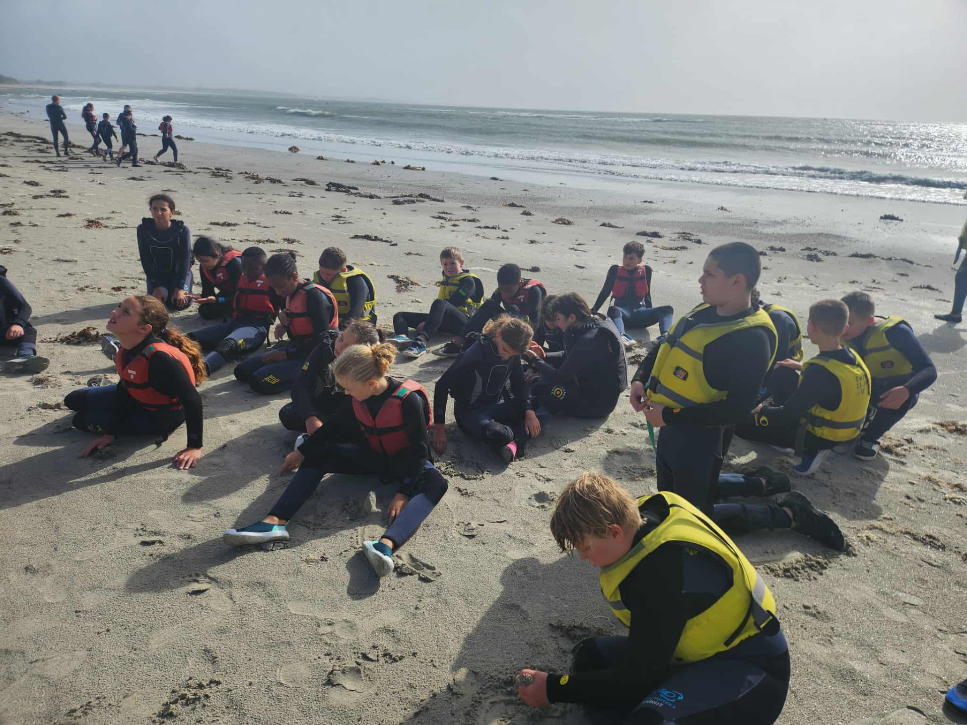 Sur les photos, les 6e 6 et 6e 3 : après une arrivée sous la pluie, le soleil fait une petite apparition et c’est le moment du test anti panique sur la plage.
