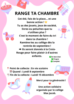Les dons pourront être déposés à la vie scolaire du collège. La collecte se déroulera du lundi 8 septembre au lundi 15 décembre 2025.